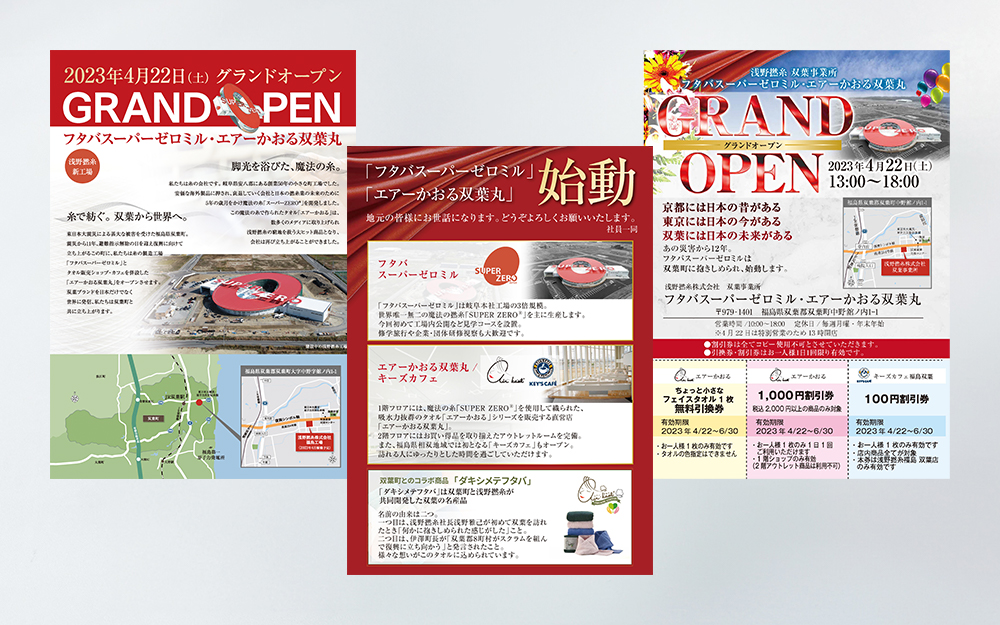 新たに新工場・新事業所を立ち上げるにあたりご相談をいただき、様々な紙媒体を用いて大々的にオープニング広告を展開させていただきました。 東日本大震災の被災地「福島県双葉郡双葉町」に建設された新工場は「復興のシンボル」でもあることから、弊社も広告代理店としてできることを考え、街を盛り上げる一助となるべく、誠心誠意新事業の立ち上げをお手伝いいたしました。オープニング告知以外にも、新商品やイベント開催の広告もご依頼いただき、広告をきっかけとした来場者数などの反響にご満足いただくなど、幅広く事業をサポートさせていただいております。